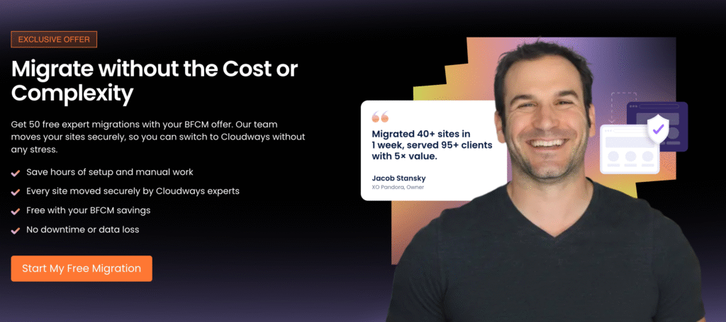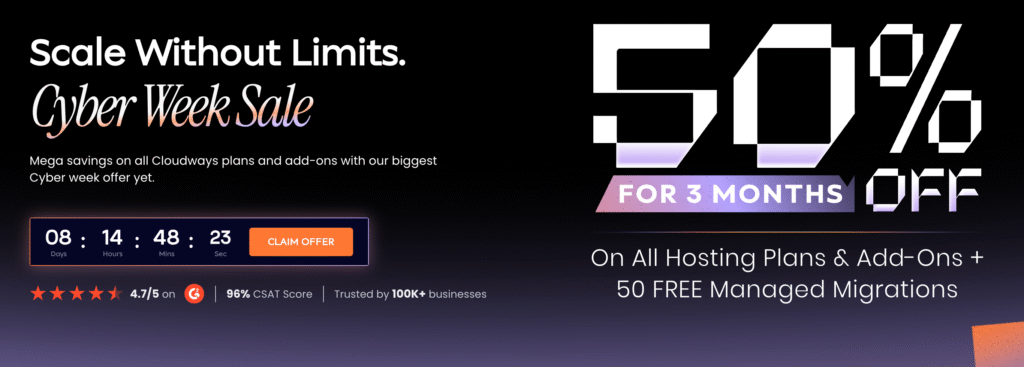 Cloudways’ Black Friday deal gives you 50% OFF for the first 3 months on any plan plus up to 50 free website migrations. Combined with a 3-day free trial, zero lock-ins, and no credit card required to start, this is the perfect moment to upgrade your hosting to something powerful, reliable, and scalable.
